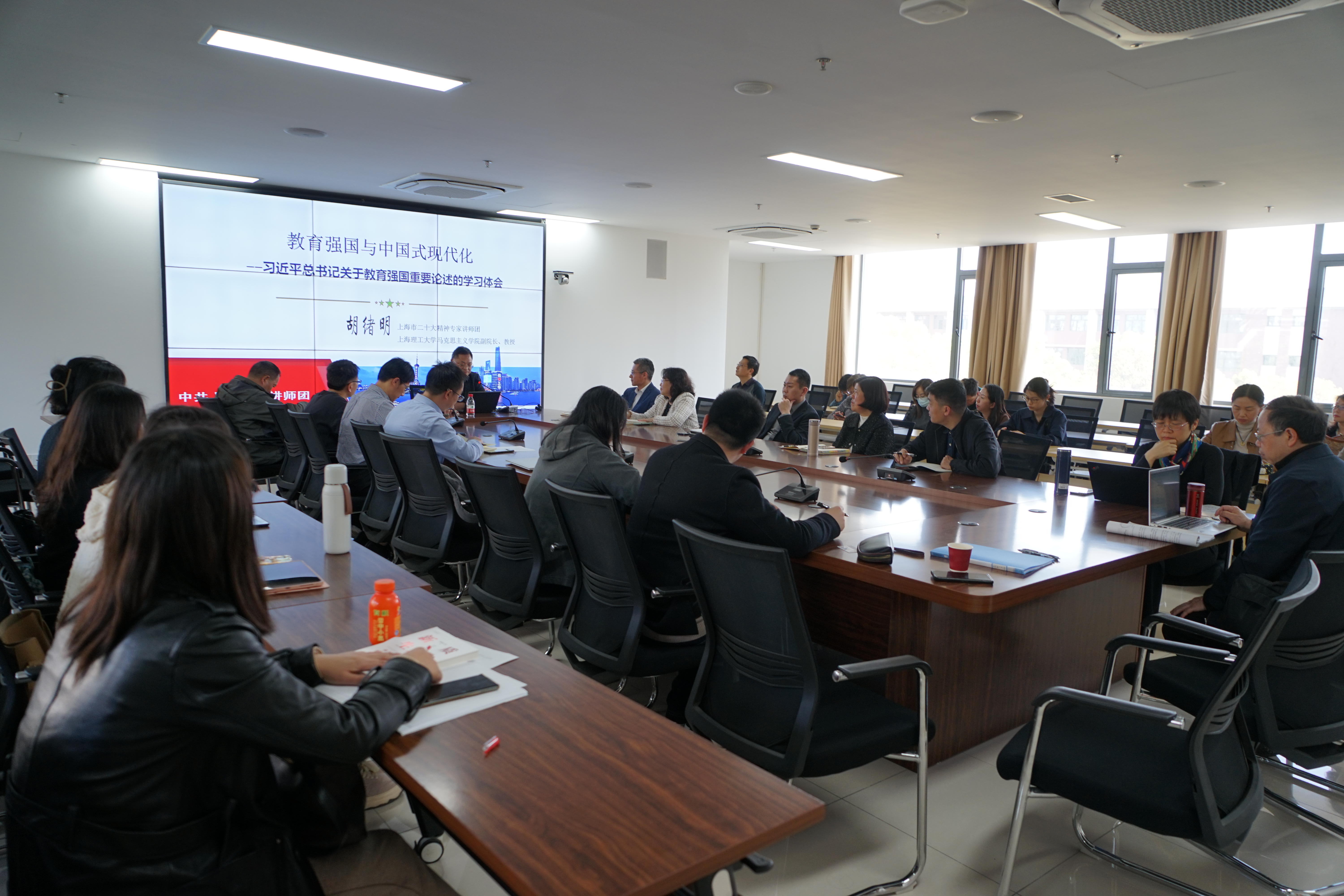 49日下午,中德国际学院党委与外语学院党委中心组在国合楼407举行中心组联组学习会,会议邀请到中共上海市委讲师团成员、学校马克思主义学院副院长胡绪明教授做专题辅导报告。中德国际学院党委委员、支部书记和师生党员代表与外语学院党委委员、支部书记、支部委员、师生党员代表,50余人参加了学习会。学习会由中德国际学院党委书记范正飞主持。