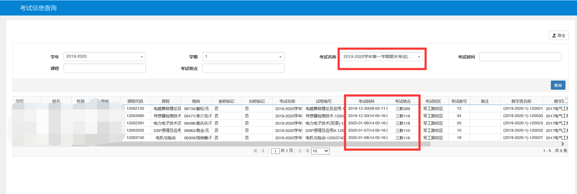 登录后,点击“信息查询”→点击“考试信息查询”→选择学年为“2019-2020”,学期为“1”,考试名称 “2019-2020学年第一学期期末考试” →点击“查询”按钮。具体步骤如下: