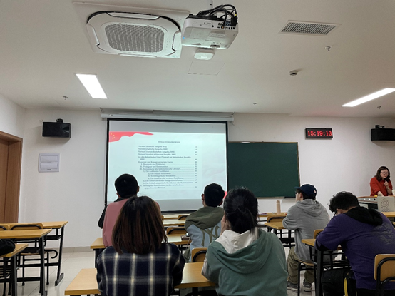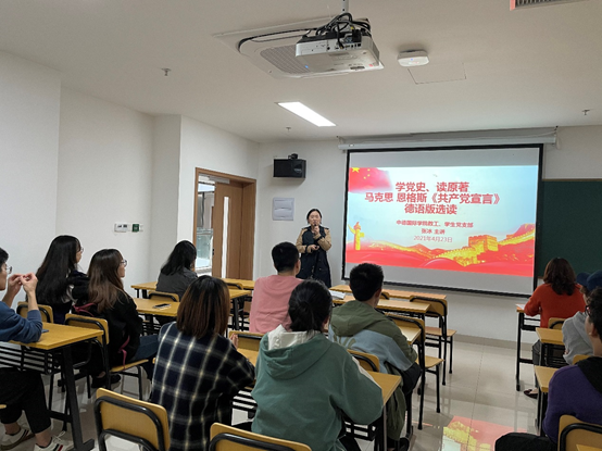 此次活动以读书会的形式开展,中德国际学院教工和学生党支部群策群力,共同谋划,党员教师们认真讨论精心设计,做好对此次学习活动的指导。党员教师张冰主动领衔负责主讲,为了讲好这堂课,她课前认真研读了中德文版的《共产党宣言》,并从书中节选了一些经典的段落和同学们一起学习。学生通过张冰老师给出的中文版线索找到德语原文中的对应原文,并学习其中的主旨思想。学习后,学院学生党支部的全体成员和入党积极分子们交流了学习体会。
