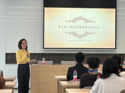 上海理工大学中德国际学院德语是本次活动的特邀单位,我院德语教研室主任王晔应邀作了题为《春之歌:探索中德诗词文化交流》的报告。报告分为“德国诗词鉴赏”、“歌德与李白”、“中德现代诗词交流”三部分,带领侨界人士和文学爱好者穿越时空,展开与诗人的深入对话,品味到了德国诗歌的典雅,中国诗词的浪漫,近距离感受中德诗词的魅力,彼此相融碰撞出火花。