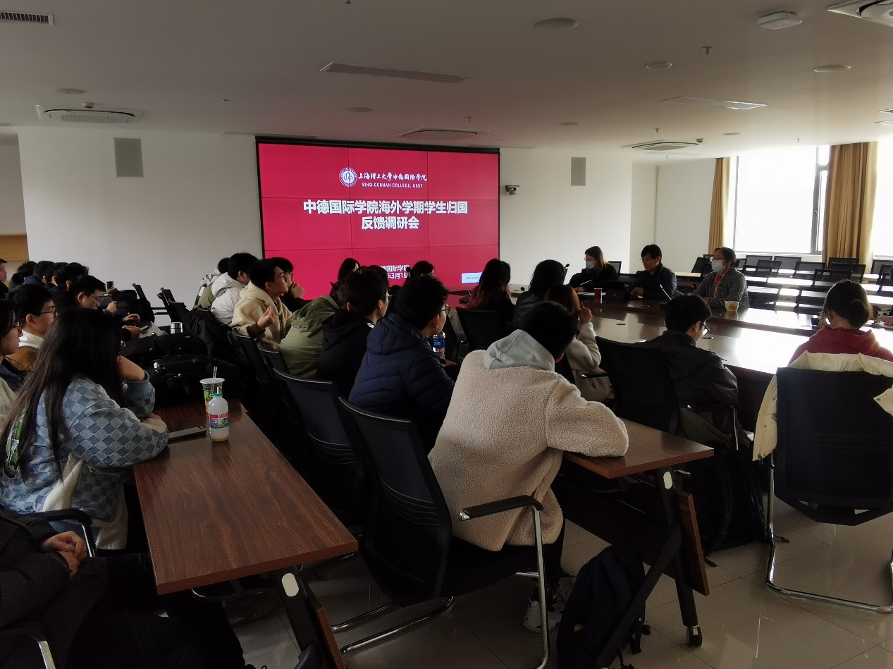 为贯彻中德国际学院国际化办学理念,推动海外学期高质量发展,解决学生在海外学期存在的问题。中德国际学院于2024年3月18日在国合楼召开海外学期学生归国反馈调研会,会议由德国学术交流中心(DAAD)特派专家Gallardo女士主持,邀请了刚结束海外学期的21级电气学生参与交流反馈。学院常务副院长陈琦、党委副书记、副院长徐芳、外事专员陈家怡、辅导员李屹等参加了此会议。