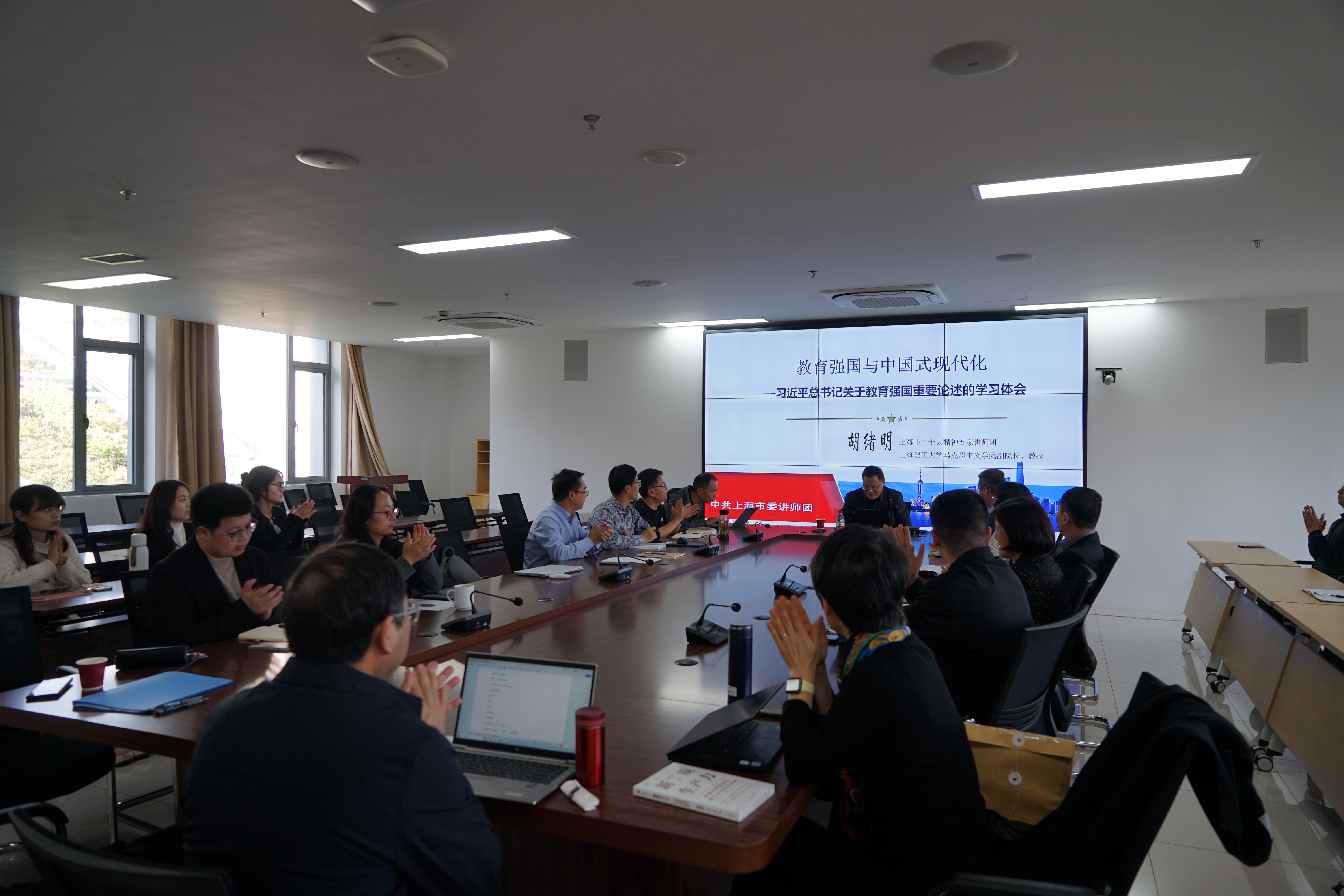 49日下午,中德国际学院党委与外语学院党委中心组在国合楼407举行中心组联组学习会,会议邀请到中共上海市委讲师团成员、学校马克思主义学院副院长胡绪明教授做专题辅导报告。中德国际学院党委委员、支部书记和师生党员代表与外语学院党委委员、支部书记、支部委员、师生党员代表,50余人参加了学习会。学习会由中德国际学院党委书记范正飞主持。